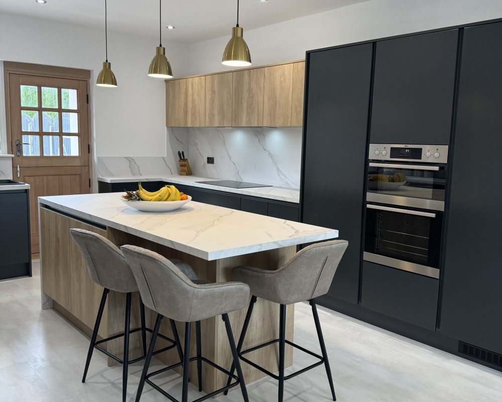 This dark grey and natural oak contemporary design generates a warm but minimal aesthetic. The clean lines of the furniture create a simple open space to enjoy dining and entertaining for years to come. The bold graphite and oak colours are contrasted by the concrete floor and marble effect worktop. Extending the worktops up the wall gives the design a complete look and keeps in mind the ease of cleaning. Integrated bins keep the floor space at an optimum whilst reducing clutter.